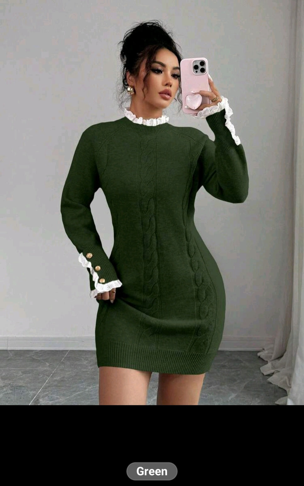 Autumn/Winter long sleeve twist rope crew neck trim Green dress