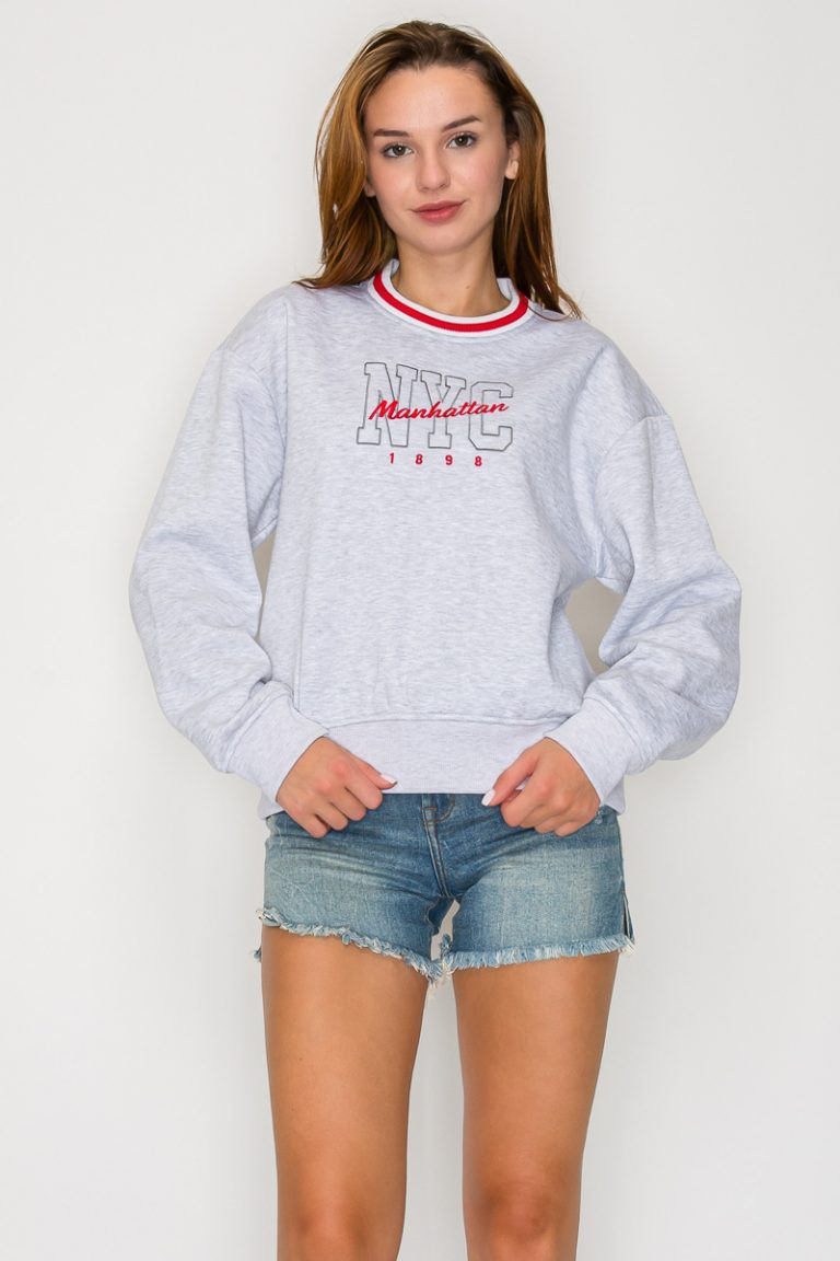 This sweatshirt top in a solid color features a round neckline with accented ribbed bands, long sleeves, a straight-cut silhouette with dropped shoulders, and a waist-length hem.